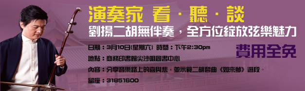 胡無伴奏有甚麼竅門? 香港中樂團中胡首席劉揚將探討如何奏出完美無瑕的二胡琴音,並分享他多年來音樂路上的種種經歴。劉揚將示範二胡套曲《如來夢》選段,分析樂曲的演奏技巧。(講座以普通話進行)